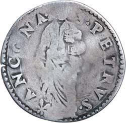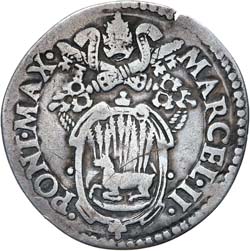 ITALY, Papal Coinage, Marcellus II (Marcello Cervini), 1555, silver giulio, 28mm, (2.61 g), Ancona mint, obv. MARCELLVS II PONT MAX, papal arms; pellet stops, rev. S PETRVS ANCONA, St. Peter standing facing, holding gospels and keys; pellet stops, (CNI XV 10-11, Muntoni 6-8; Berman 1033). Worn very good - nearly fine, very rare.