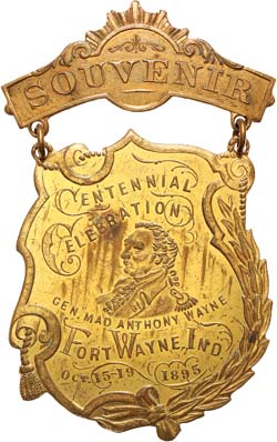 USA, CENTENNIAL CELEBRATIONS, Fort Wayne, Ind., Oct 15-19, 1895, souvenir shield shaped medalet with suspender, in brass (34x40mm) by 'Schwaab S & S.Co/Makers/Milwaukee/Wis.' Good very fine.