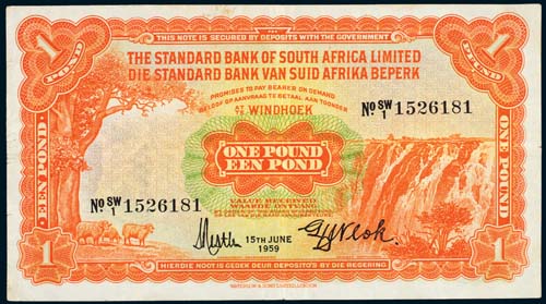 SOUTH WEST AFRICA, The Standard Bank of South Africa Limited, one pound, 15th June 1959, No SW/1 1526181 (P.11). Very fine.