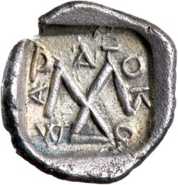 THRACE, kings of, Saratokos, (late 5th century B.C.), silver diobol (trihemiobol), 10mm, (0.83 g), obv. youthful male head right, rev. large M**D* monogram, around **SAR A TOK O*, all within incuse square, (cf.S.1719, Topalov 2005 pp.108-9, No.2, Peter, Die M?nzen der Thrakischen Dynasten, Berlin 1997, pg. 99, 2.4, Youroukova 31-37, HGC 3, 1681). VF, toned.