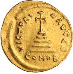 TIBERIUS II CONSTANTINE, (A.D. 578-582), gold solidus (4.44 g), Constantinople mint, 9th officina, struck 579-582, obv. crowned and cuirassed bust facing, holding globus cruciger and shield, around dM TIb CONS TANT P P AVI, rev. cross potent set on four steps, around VICTORI A AVGG**Q*, CONOB in exergue, (S.422, DOC 4i, MIB 4). Good very fine with a weakly struck wavy obverse.