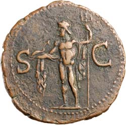 AGRIPPA, (died 12 B.C.), posthumous issue struck by Caligula (A.D. 37-41), AE as, (10.76 g), obv. M AGRIPPA L F COS III, head to left wearing rostral crown, rev. S C across, Neptune standing to left, holding dolphin and trident, (S.1812, RIC 58 (Caligula), C.3). Brown patina, nearly very fine and scarce in this condition.