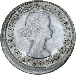 ELIZABETH II, sixpence, 1962, struck ten percent off centre, out of collar, plain edge. Extremely fine.