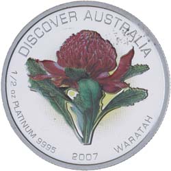 ELIZABETH II, Perth Mint, coloured proof half ounce platinum fifty dollars, 2007, Discover Australia, Waratah. ...