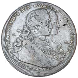 ITALY, Naples under Spanish Rule, Kingdom of Naples, Ferdinand IV of Bourbon (1759-1799), piastra of 120 Grana 1772, 40mm, (24.97 g), birth of princess Maria Theresa cojoined busts of Ferdinand and Maria Carolina to right, rev. seated figure to left with infant, FECVNDITAS above, M THERESIA NATA NON IVN I in exergue, (CNI 38, Pannuti-Riccio 47, Daven. 1403, KM.C.65). Toned, fine and rare.