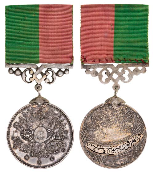 TURKEY, Ottoman Empire, Imtiyaz Medal (AKA Nishan-i-Imyiaz Medal) (Loyalty and Bravery Medal) in silver, instituted AH1300 (1882), reverse inscribed in Turkish to recipient and dated AH1316 (1898). Heavily toned, a few very small edge nicks, otherwise extremely fine.
