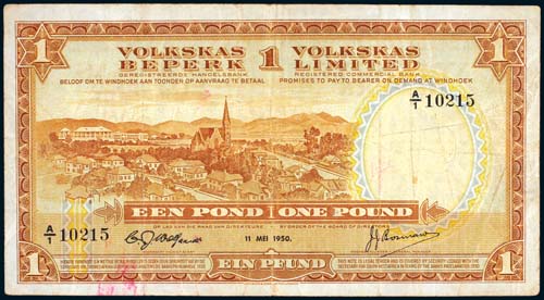 SOUTHWEST AFRICA, Volkskas (Bank) Limited, one pound, Windhoek 11 Mei (May) 1950, A/1 10215 (P.14a, date not listed in Pick). Fine.
