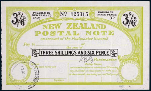 NEW ZEALAND, Postal Note, Type 7c-6, three shillings and sixpence (3d), issued Bryndwr 13/12/4?. Extremely fine and scarce.