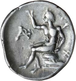 PELOPONNESOS, Arkadia, The Arkadian League, Megalopolis mint, silver triobol, (c.320-275 B.C.), (2.75 g), obv. Zeus laureate head to left, rev. naked Pan seated to left, on rock, hand raised, holding a lagobolon in left hand, ARK monogram in field to left X, to right, (S.2687, BCD [LHS 96] 1526, BMC 54 [p.174], Dengate Period I, issue 3 [p.63] [ANSMN 13], HGC 5, 929). Lightly toned, good very fine/good fine and rare.