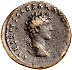 ANTONINUS PIUS, with Marcus Aurelius as Caesar, (A.D. 138-161), AE sestertius, Rome mint, issued 141-3, (24.16 g), obv. ANTONINVS AVG PIVS P P TR P COS III, laureate head of Antoninus Pius to right, rev. AVRELIVS CAESAR AVG [PII F COS], bare head of Marcus Aurelius to right, S C below, (S.4526, RIC 1212, C.34). Deep brown toning, mild surface pitting, otherwise nearly very fine - very fine and scarce.