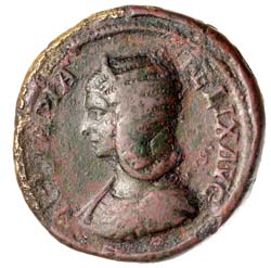 This very rare sestertius of Julia Domna, issued at Rome in AD 214, is on the same theme and records vows for the health of Caracalla undertaken by the Vestal Virgins in a ceremony before the Temple of Vesta. The four Vestals are accompanied by two children and the sanctuary itself appears as a small domed structure in the background. Over the centuries no fewer than seven temples of Vesta occupied the site in the Forum at the northern corner of the house of Vestals. Most were the victims of fire, the sixth temple having been destroyed late in the reign of Commodus (AD 191). Julia Domna herself built the seventh, and the partially reconstructed ruins of this building are still to be seen today. (This note courtesy of CNG)