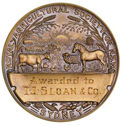 ROYAL AGRICULTURAL SOCIETY OF N.S.W., Sydney, Royal Easter Show, 1937, prize medal in bronze (54mm), by Stokes, Melb(ourne), reverse inscribed, 'Awarded to/I.J.Sloan & Co.', in Stokes & Sons case of issue. Nearly uncirculated.