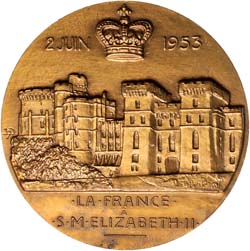 CORONATION OF QUEEN ELIZABETH II, 1953, in bronze (51mm) by H.Dropsy, obverse, draped bust right, reverse, with view of Windsor Castle, inscription in French (Eimer 2087); Royal Visit to Paris, 1957, in bronze (72mm) by H.Dropsy, obverse, conjoined busts of Elizabeth and Phillip, crowned and draped right, reverse, figures of France and Britannia standing shaking hands, views of the two cities behind lower half, inscription in French (Eimer 2098). Second medal with spot of Queen's cheek, both are in circular crimson boxes, good extremely fine. (2)