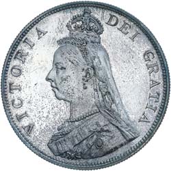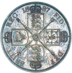 1887 PROOF DOUBLE FLORIN (FOUR SHILLINGS), Victoria, 1837-1901. S-3922, ESC-2696, L&S 97, Davies 540 (R). 22.34g. Obverse - Joachim E. Boehm's Jubilee bust with small crown and veil, J.E.B. on truncation. Reverse - Roman I in date; Royal Arms present as four crowned shields in cruciform pattern centred by a Garter star. In the angles are four sceptres featuring symbols for the three kingdoms, i.e. England (sceptre with a cross), Ireland (harp) and Scotland (thistle). The interupted legend reads REG: 18 (crown) 87 FID: (crown) DEF: (crown) BRITT: (crown). This reverse takes inspiration from the 17th C Thomas Simon's five guineas design. However, the public soon gave the disparaging moniker "radiating kitchen pokers and tea trays." Brilliant, reverse blue toned, FDC and rare.