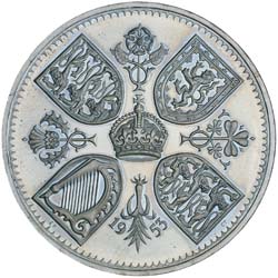 1953 VIP CROWN, Elizabeth II, 1952-. Proof "V.I.P." 5 Shillings (Crown), S-4136. ESC- 4333. L&S-3, Davies 2280. Incuse lettered edge *FAITH AND TRUTH I WILL BEAR UNTO YOU. 28.01g. CuNi V.I.P. issue. R3. Obverse: by G. Ledward (initials behind rear hoof) QEII on horseback (Winston) separating a pair of royal cyphers. The legend reads ELIZABETH . II. DEI. GRATIA. BRITT. OMN. REGINA.FIDEI. DEFENSOR * FIVE SHILLINGS* Reverse: by C. Thomas (initials under Irish Shield) and E. Fuller (initials under English Shield) comprises four shields in saltire pattern bearing arms of England, Scotland, Ireland and England radiating from a central crown. The shields are separated by the floral emblems of all four constituent kingdoms and principality, with the Welsh leek separating the date. This VIP issue is distinguishable from proof coins by the extra polishing treatments applied to both the flan and acid-etched dies and extra care in striking resulting in a deeper frosted cameo appearance with mirrored fields. Deep cameo, FDC and very rare.