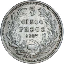 CHILE, Republic, five pesos 1927 (KM.173.1) (illustrated); one peso 1910 (KM,.152.3), 1921, 1922 (3) (KM.152.5); 2 1/2 centavos 1886, 1895, 1898 (KM.150); 2 centavos 1871 (KM.147); one centavo 1851 (3) (KM.119), another 1851 (KM.120); half centavo 1853 (3) (KM.126). Fine - extremely fine. (18)