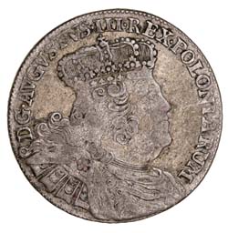 POLAND, August III, silver eighteen groszy, 1755 (KM.148.2). Grey toned patina, good fine.