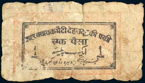 INDIA, local issue, private, one rupee 1920, imprint Albalagh Press Calcutta, serial 51929 on back rubber bank stamp and Hindi writing; WWII prison coupon, L.Deep Chand Jain, Government Treasurer valid up to 31st Dec 1943, 1 pie (?) or pice. Frail, only fair. (2)