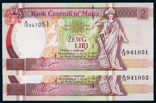 MALTA, Bank Centrali ta' Malta, two lira (L.1967 [1994]) (P.45) a pair of pairs. Uncirculated. ...