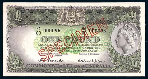ONE POUND, Coombs/Wilson (1953), HA/00 000096 (R type I specimen note), diagonal specimen overprint in ...