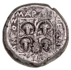 THRACE, Maroneia, silver tridrachm (16.23g), c.386-347 B.C., under the Magistrate, Megakleos, obv. Head of young Dionysos left, wearing ivy-wreath,. rev. MAPONI / TE**WN - EP - MEGAK - LEOS*, grape vine with four bunches of grapes, leaves and tendrils, all within linear square, (S.-, Schonert-Geiss 390, cf.Boston 812, HGC 3, 1532, [R2]). Nearly very fine and very rare, high relief with old grey tone.