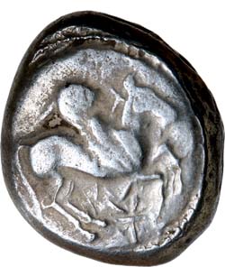Xanthus has been suggested as the likely mint for this and related issues (See G.K. Jenkins, "Recent acquisitions of Greek Coins by the British Museum", NC 1959, p.33). However this may be questioned, since this stater and all the related pieces in the SNG Berry, ACNAC Rosen and SNG Von Aulock all fall clearly into the heavy weight classification. Thus Morkholm has in "The Classification of Lycian coins before Alexander the Great" (JNG 1964, pp 65ff), assembled evidence indicating that Xanthus was the home of the light standard and the heavy standard circulated in Central Lycia. That standard cannot be identified with any in use outside Lycia. The letter on the obverse represents a "kh", the initial letter of the dynast's name. The triskeles on the reverse is a solar symbol and a distinctive Lycian emblem connected with the national deity, Apollo. A most interesting coin bearing Lycian script.