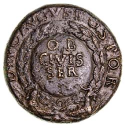 DIVUS AUGUSTUS, (after AD 14), Orichalcum sestertius, (28.69 g). Rome, under Tiberius, issued A.D. 35-36, obv. OB CIVES SER inscribed on shield surrounded by oak wreath, DIVO AVGVSTO S P Q R around, two adduced Capricorns and globe below, rev. TI. CAESAR DIVI AVG F AVGVST P M TR POT XXXVIII around large S C, (S.1763, RIC [Tiberius] 63, BMC 109, C. [Augustus] 303). Dark brown patina with minor reverse roughness, otherwise good very fine and rare.
