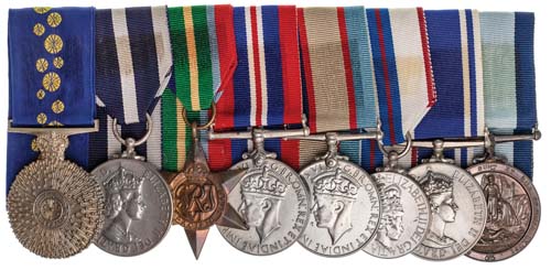 GROUP OF EIGHT TO HEROIC AND RESPECTED POLICE OFFICER: Medal of the Order of Australia (OAM); Queen's Police Medal (QPM); Pacific Star; War Medal 1939-45; Australia Service Medal 1939-45; Jubilee Medal 1977; Police Long Service and Good Conduct Medal (QEII type 1); Royal Shipwreck Relief Humane Society of N.S.W. Bronze Medal. Russell Nelson Crook on first medal, Russell N.Crook, Insp. Class 1. N.S.Wales Police. on second medal, NX83455 R.N.Crook on third to fifth medals, sixth medal unnamed as issued, Russell N.Crook on seventh medal, Constable R.N.Crook Saving Life 10.10.1946 on last medal. First medal pantographed, second to fifth and seventh medals impressed, last medal engraved. Display mounted, contact marks on a few medals, otherwise very fine.