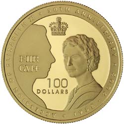 ELIZABETH II, proof gold one ounce one hundred dollars and silver fifty cents 2002, Elizabeth ...