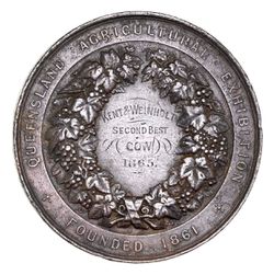 QUEENSLAND AGRICULTURAL EXHIBITION, Founded 1861, (Toowoomba), in bronze (64mm), by J.S. & A.B.Wyon, reverse inscribed, 'Kent & Weinholt/Second Best/Cow/1865.'. Edge nicks and one time water affected, otherwise good fine and scarce.