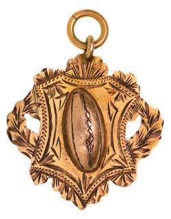 B.F.C. (Balmoral Football Club), handcrafted fob medal in voided gold (9ct; 2.62g; 25x23.5mm), by H.P, ring top suspension, reverse inscribed, 'B.F.C./Winners/H.Chenet/1924'. Small dent to football on obverse, otherwise very fine.