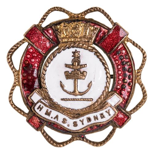 H.M.A.S. Sydney, a small hoard of badges in gilt and enamel, includes sweetheart badges (29x31mm), in shape of a lifebuoy with crest of HMAS Sydney in centre, pin-back (8 red, 2 blue); Good Luck souvenir badges (24x24mm), ship's crest in horseshoe, pin-back (6); lapel badges (20x23mm), ship's crest (7, six with button back and one with stick-pin); tie-bar badge (20x23mm), ship's crest on pin-back tie-bar (7); also triangular serviette holder in brass with gilt and enamel ship's crest affixed to one side, all stored in a lacquered timber hinged lid case. One of each type of badge illustrated, mostly very fine - extremely fine. (31)