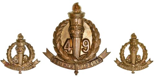 49TH INFANTRY BATTALION (THE STANLEY REGIMENT), 1930-42, hat badge in brass (53.5mm), and a pair of collar badges in brass (30mm) (Cossum p27, a). Very fine. (3)