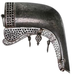 GUN POWDER OR PRIMING FLASK, in metal (approx 10x10cm), with handcrafted decorated stars sections, said to be of 17th century Russian origin, pivoted opening after pulling the spring-loaded trigger lever, with two suspension brackets fitted. Good very fine.