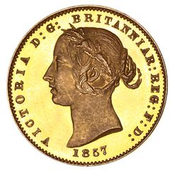 QUEEN VICTORIA, proof half sovereign 1857, wreathed head left, by L.C.Wyon (3.93g) plain edge, struck ...