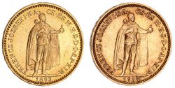 HUNGARY, Franz Joseph, ten korona, 1894 and 1912 (KM.485). Nearly extremely fine. (2)