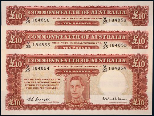 TEN POUNDS, Coombs/Wilson (1952) V/23 184854/6 (R.61) three consecutive notes. Crisp originals with full, raised-ink, ...
