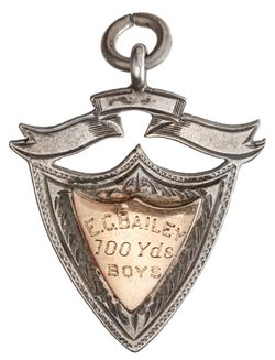 PEACE DAY, 1919, fob medal in silver and gold (30x28mm), no maker, ring top suspension, obverse inscribed 'E.C.Bailey/100 Yds/Boys'. Very fine.