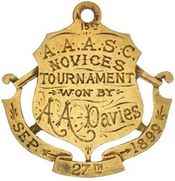 A.A.A.S.C. (A (?) Auckland Amateur Sports Club), fob medal, handcrafted in gold (15ct, 9.2g, 26x25mm), by A.T. (Anton Teutenberg, Auckland), ring top suspension, obverse inscribed 'Presented by/T.Harle Giles', reverse inscribed 'A.A.A.S.C./Novices/Tournament/Won By/A.A.Davies/Sep 27th 1899' (D&C.S25 [probably this piece]). Good very fine.