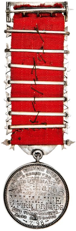 UNITED FIRE BRIGADES ASSOCIATION OF N Z, Long Service Medal for five years service, in silver (39mm) by A.T. (Anton Teutenberg, Auckland), with (7) 2 Years Service bars, reverse inscribed 'Lieutenant/R.Lane/By The/Waimate/V.Fire Brigade/7.98' (D&C.L3; O&D.115). Toned, extremely fine, in a contemporary case.