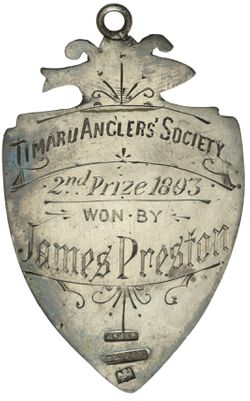 TIMARU ANGLERS' SOCIETY, handcrafted in silver (48x33mm), by McNab, Timaru, ring top suspension, reverse inscribed 'Timaru Anglers' Society/2nd Prize 1893/Won By/James Preston'. Fine.