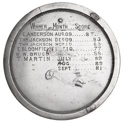 OKOIRIE (SIC) GOLF CLUB, Monthly Competition Medal, handcrafted in silver (65mm) by Kohn (A.Kohn, Auckland) for monthly competition, won by Thos. Martin, inscribed on reverse 'Winner Month... Score/E.Anderson Aug 09, 87/ Thn.Jackson Dec 09, 87/Thn.Jackson Mch 10, 83/E.Bloomfield Oct...10, 77/W.W.Bruce (?)... 88/T.Martin July, 90 /" Aug, 89/" Sept, 81'. Mount removed from reverse rim, otherwise very fine.