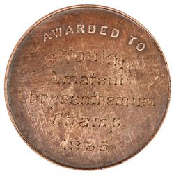 DUNEDIN HORTICULTURAL SOCIETY, struck in copper (35mm), no maker, reverse inscribed 'S.Tonkin/Amateur/Chrysanthemum/Champ/1935'. Cleaned, now retoning, ...