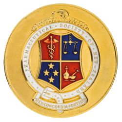 PHARMACEUTICAL SOCIETY OF NEW ZEALAND, c1990s, award medal, uniface, struck in gilt and enamel (51mm), ...