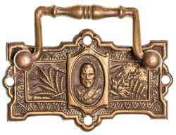 BRASS DRAWER HANDLES, c1900, (110x60mm) (3) and (65x40mm) (2, one illustrated), no maker (Anton Tuetenberg, Auckland) (D&C.plate LXIX). Fine - very fine. (5)