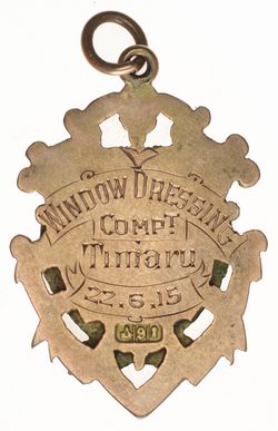 WINDOW DRESSING COMPET., Timaru, 22-6-15, inscribed fob medal, handcrafted in gold (9ct, 6.1g, 35x25mm), unidentified ...