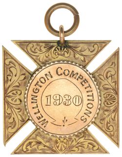WELLINGTON COMPETITIONS, 1930, fob medal, handcrafted in gold (9ct, 7.5g, 30x28mm), no maker, ring top ...