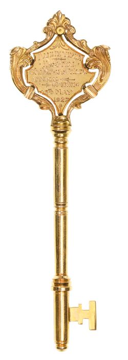 DANNEVIRKE HOSPITAL, presentation key, handcrafted in gold (9ct, 19.5g, 98x30mm), no maker, inscribed on one side, 'Dannevirke/Hospital/Childrens Ward/Official/Opening/25th May/1927', the other side 'Presented To/Hon.J.A.Young/By/W.A.Pickard/Contractor'. Extremely fine.