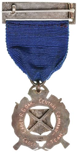 N.Z. ARMY RIFLE ASSOCIATION, 1923, struck in bronze (35x28mm), by 'B', ribbon and bar with pin-back suspension, reverse inscribed 'Cadet R.G.Oak/Central Command/Cadet Team'. Very fine.