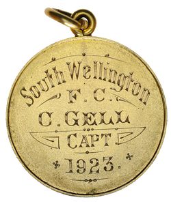 THE VICTORY CUP MEDAL, in gold (probably 9ct, 8.3g, 30x26mm), no maker (probably Mayer & Kean), ring top suspension, reverse inscribed 'South Wellington/F.C./C.Gell/Capt/1923'. Extremely fine.